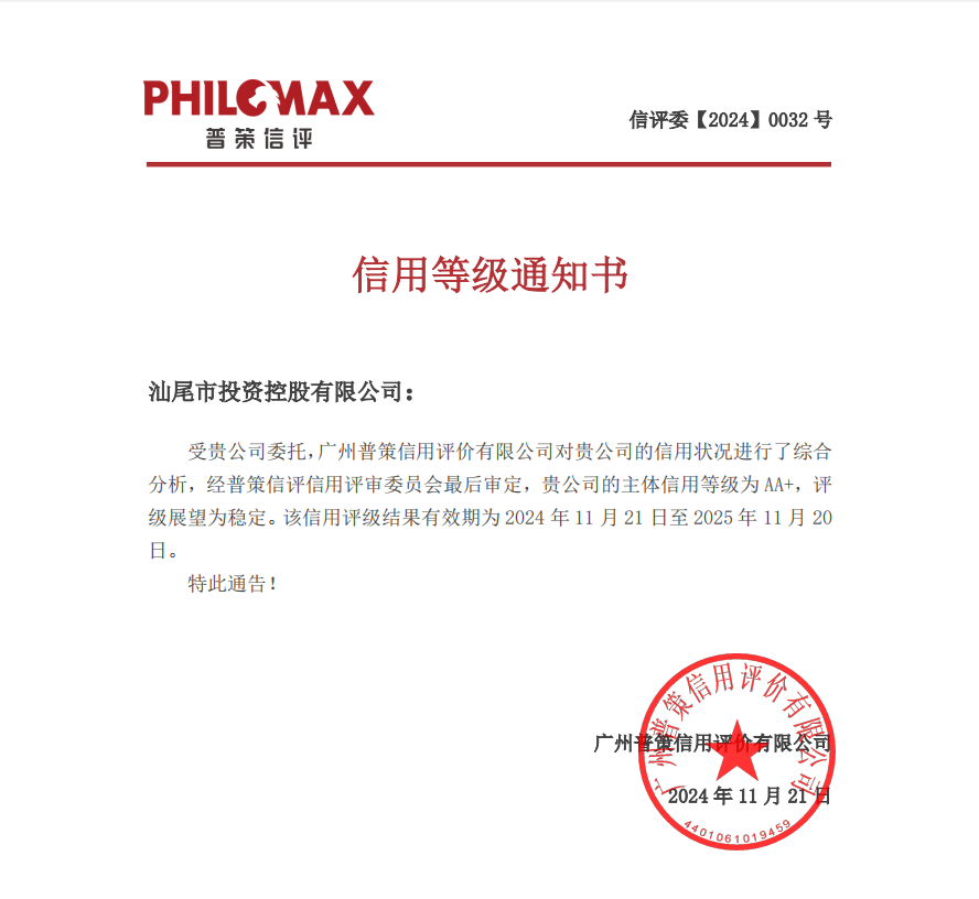 近日,經(jīng)廣州普策信用評價有限公司采用城市產(chǎn)業(yè)開發(fā)運(yùn)營企業(yè)評級模型綜合評定,汕尾市投資控股有限公司獲得主體信用AA+評級,評級展望為穩(wěn)定,成為汕尾市首家獲得AA+信用評級的國有企業(yè)。 AA+主體信用評級是資本市場信用評級的重要分水嶺,也是國內(nèi)投資級和投機(jī)級的重要劃分標(biāo)準(zhǔn)。此次獲得AA+主體信用評級,既是資本市場對汕尾投控在市場競爭力、運(yùn)營能力和可持續(xù)發(fā)展能力等方面的認(rèn)可和肯定,也有利于提振汕尾資本市場形象,提升公司市場競爭力和影響力,為加快實(shí)現(xiàn)公司高質(zhì)量發(fā)展提供更大規(guī)模、更多渠道、更低成本的資金支持。 展望未來,公司將進(jìn)一步聚焦市委市政府重點(diǎn)工作部署和“4+X”主業(yè)主責(zé)、“5+1+N”業(yè)務(wù)板塊,充分發(fā)揮AA+主體信用評級優(yōu)勢,牢牢把握市場機(jī)遇,不斷拓展融資渠道、降低融資成本、壯大資產(chǎn)規(guī)模,持續(xù)增強(qiáng)核心功能、提升核心競爭力,全力打造“值得信賴的現(xiàn)代國企集團(tuán)”,為推動汕尾經(jīng)濟(jì)社會高質(zhì)量發(fā)展貢獻(xiàn)更大力量。